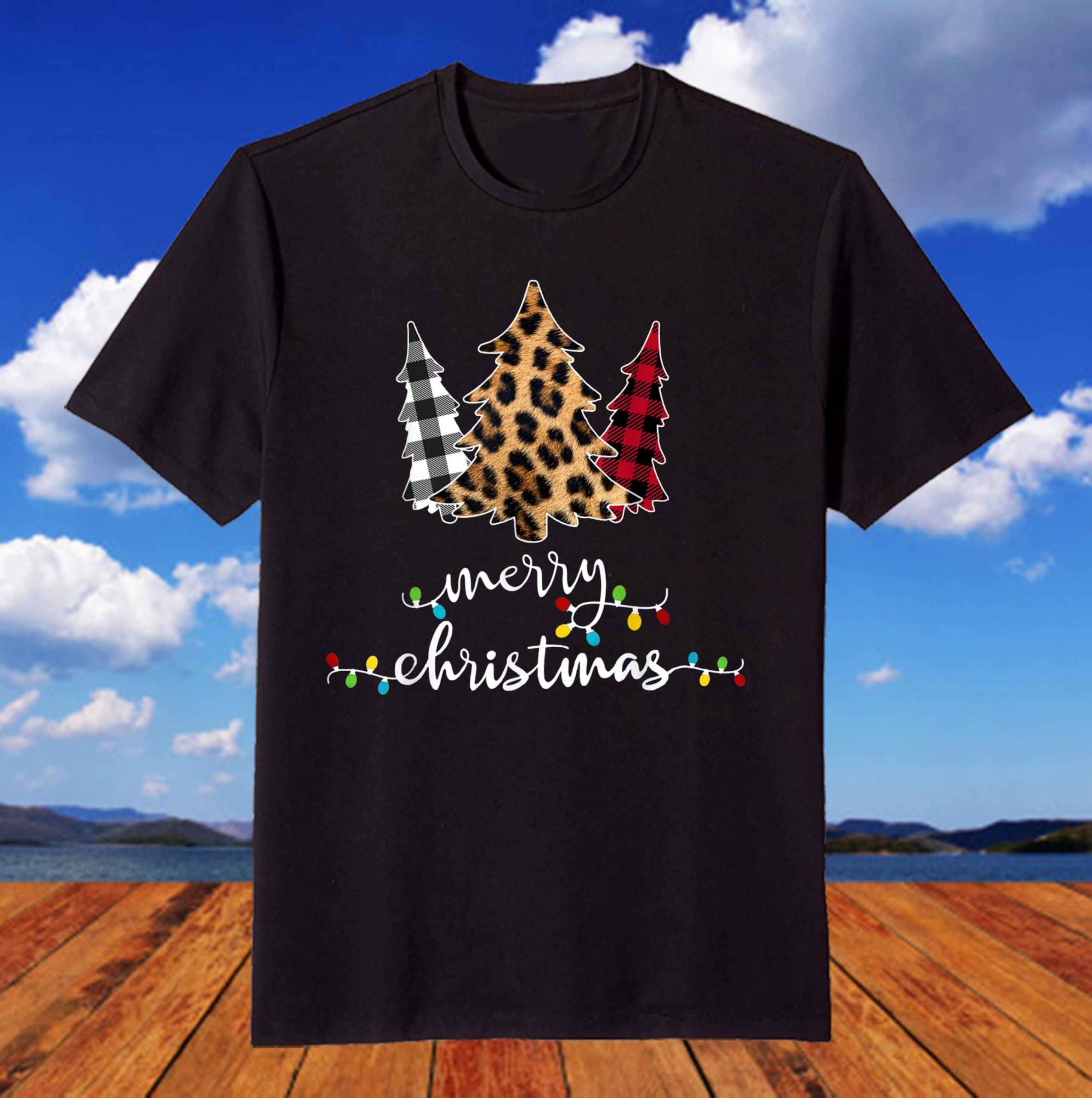 Leopard Buffalo Plaid White Red Tree Lights Merry Christmas T-Shirt