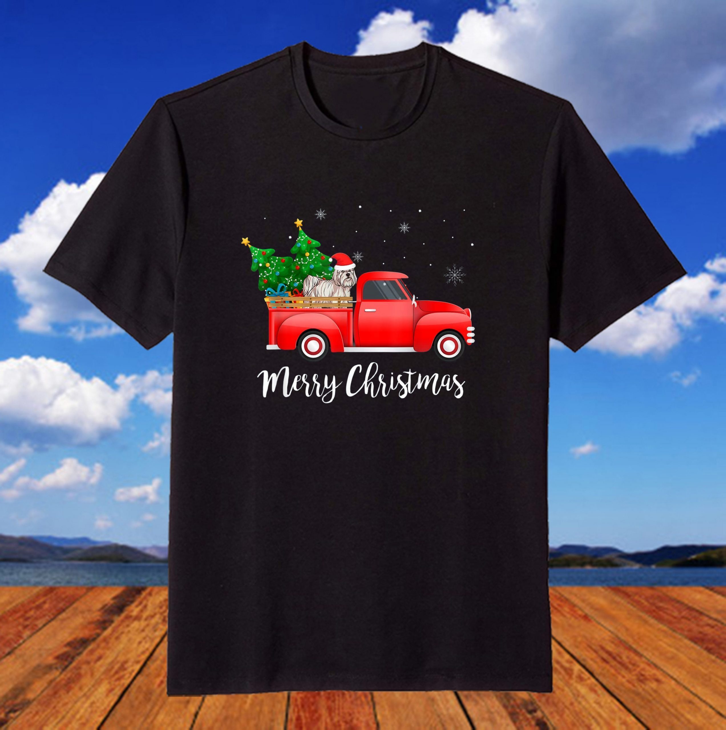 Maltese Dog Riding Red Truck Christmas T-Shirt