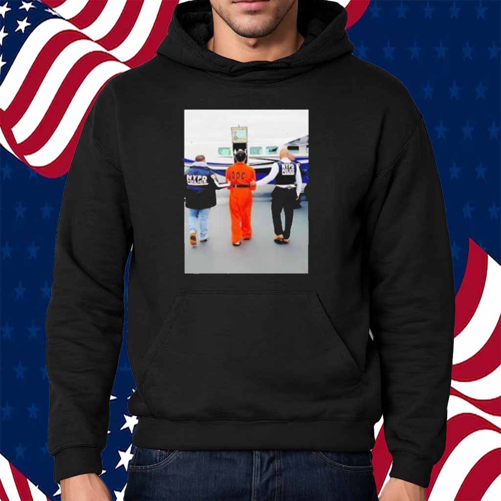 Show your support for the NYPD with this exclusive shirt featuring a photo of Luigi Mangioni being escorted from an NYPD helicopter.
