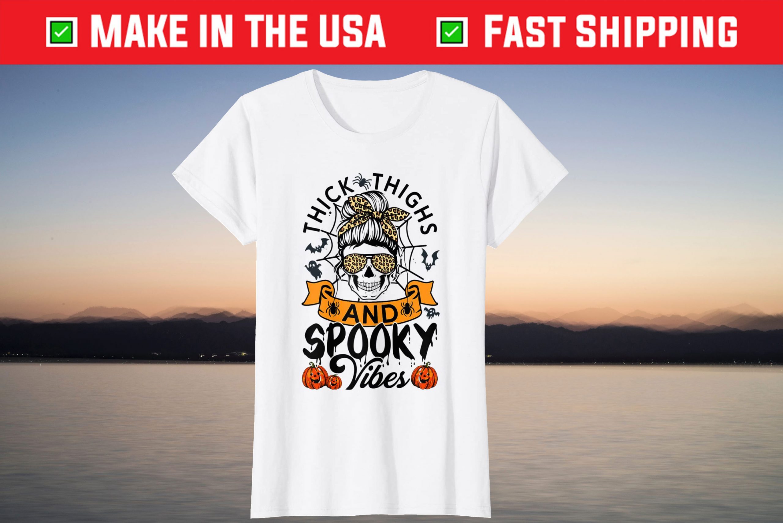 Skull Messy Bun Thick Thighs Spooky Vibes Halloween Tee Shirt